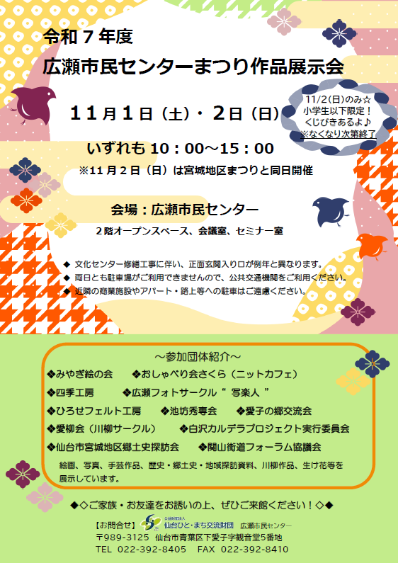第37回宮城地区まつり ’25.11.2(日) & 広瀬市民センターまつり作品展示会 11.1(土)、2(日)